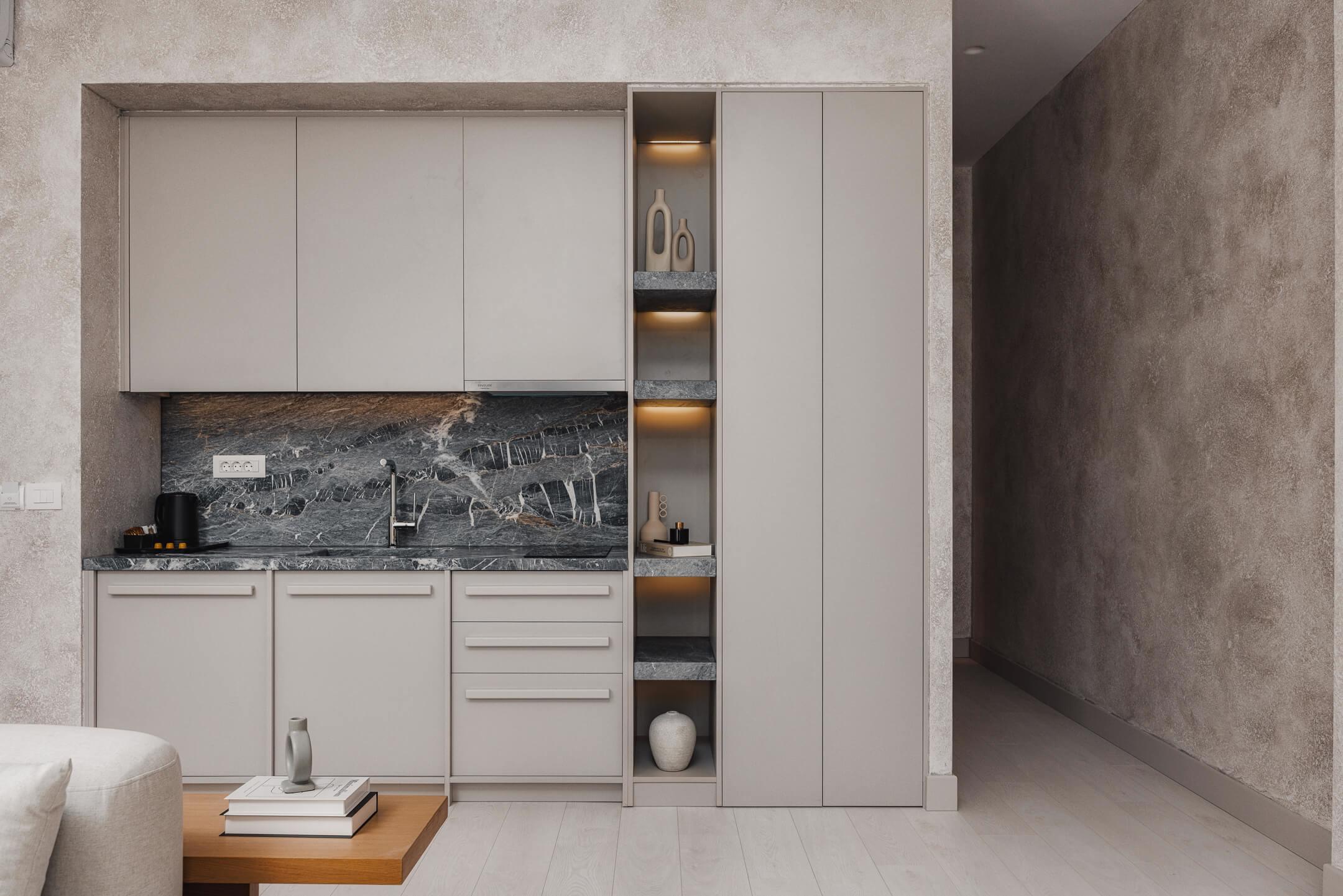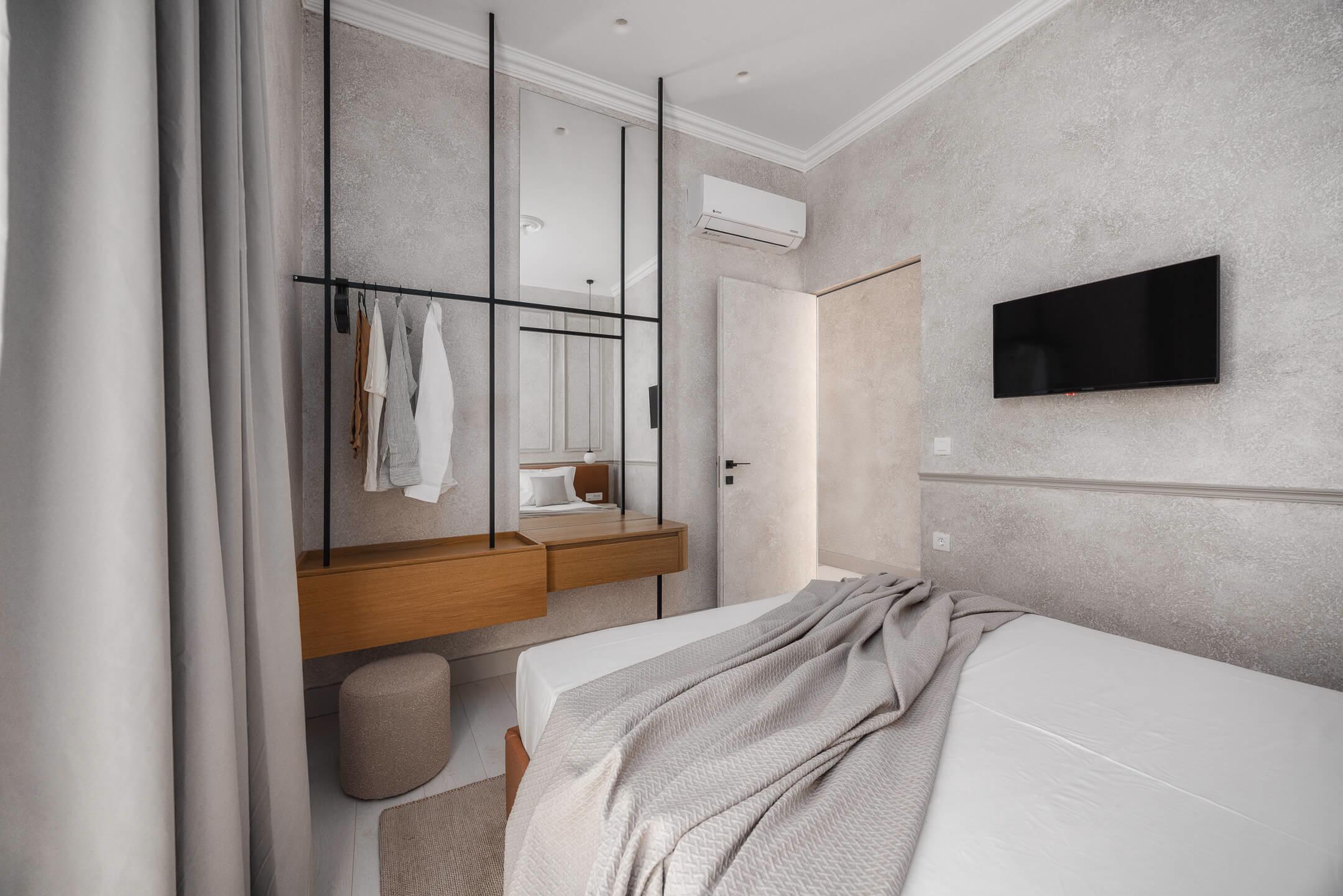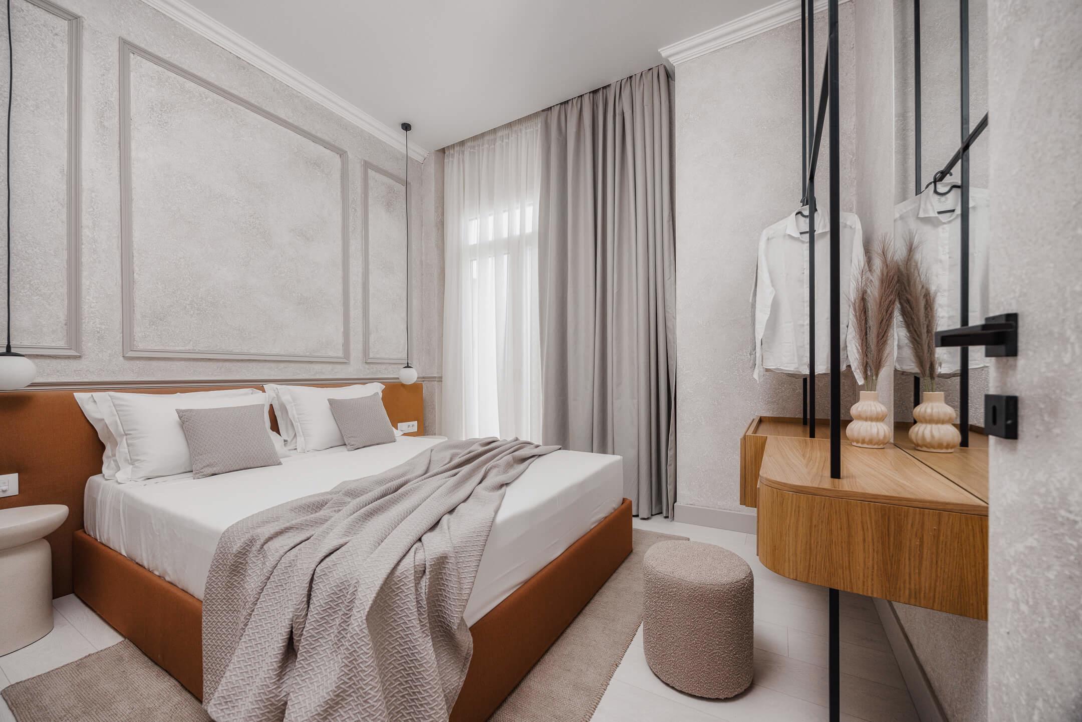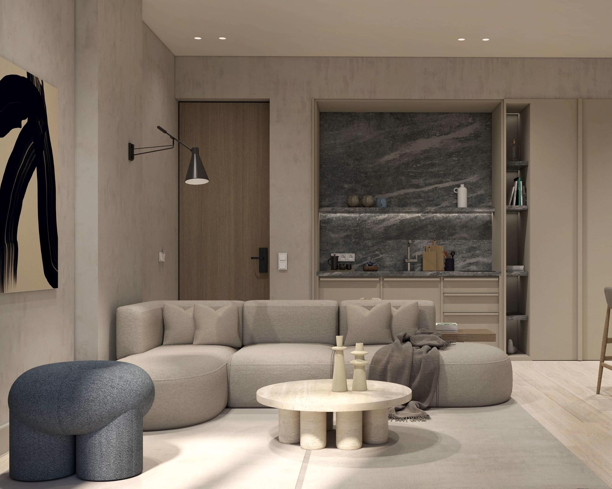 The living area is elegantly furnished with designer pieces and a Smart TV, while the fully equipped kitchen or kitchenette provides all the comforts of a modern apartment. The blend of minimal design, wood, marble, and soft textures enhances the feeling of harmony and understated luxury.