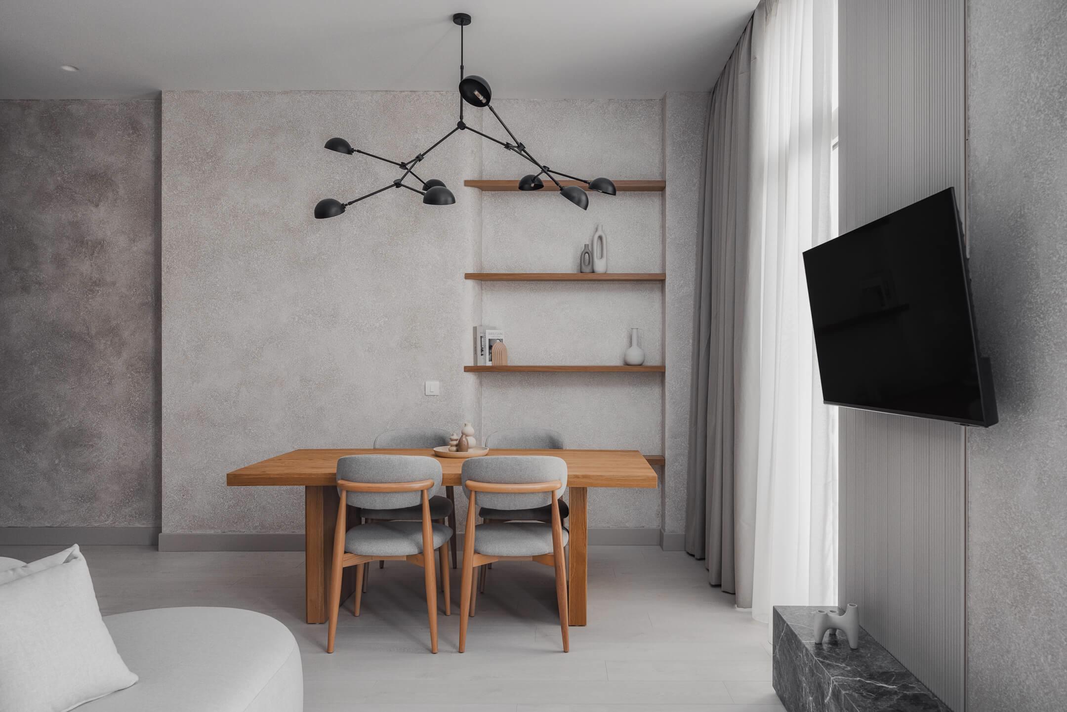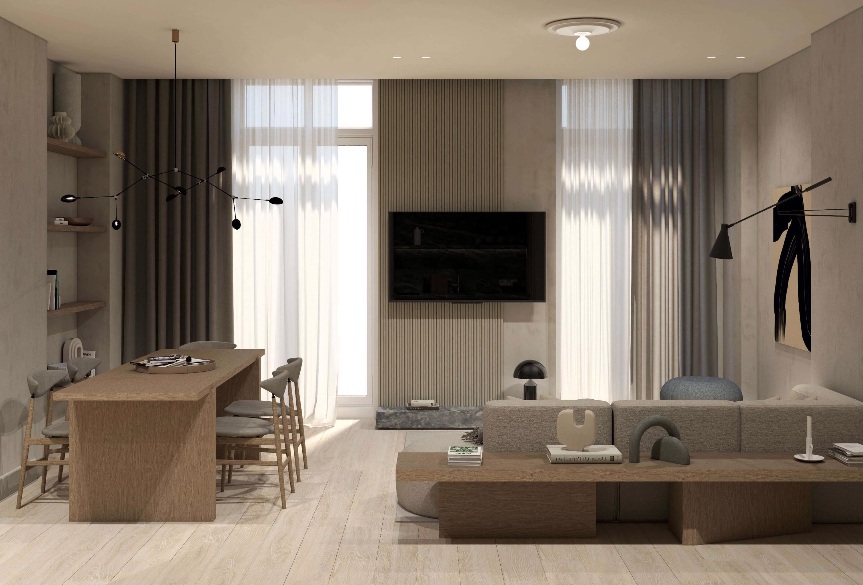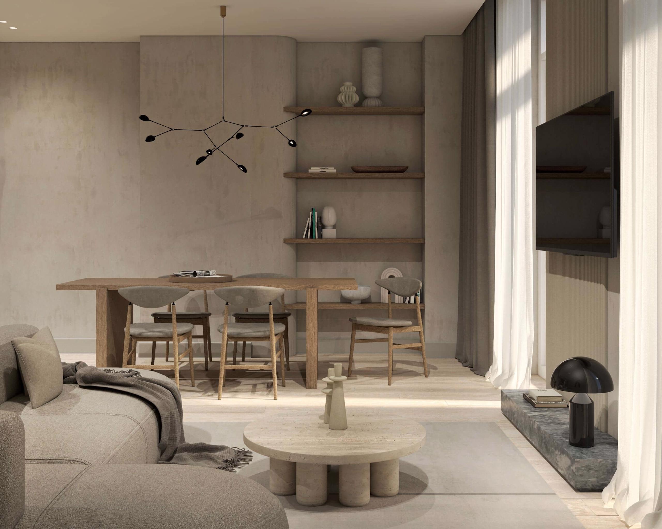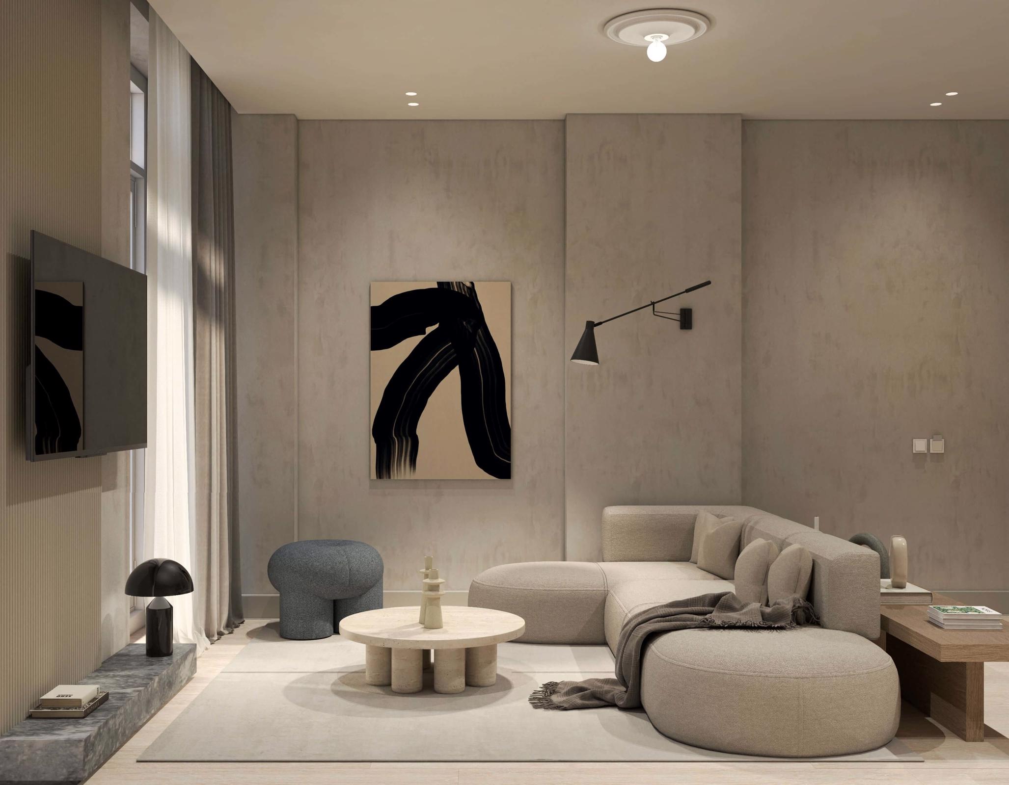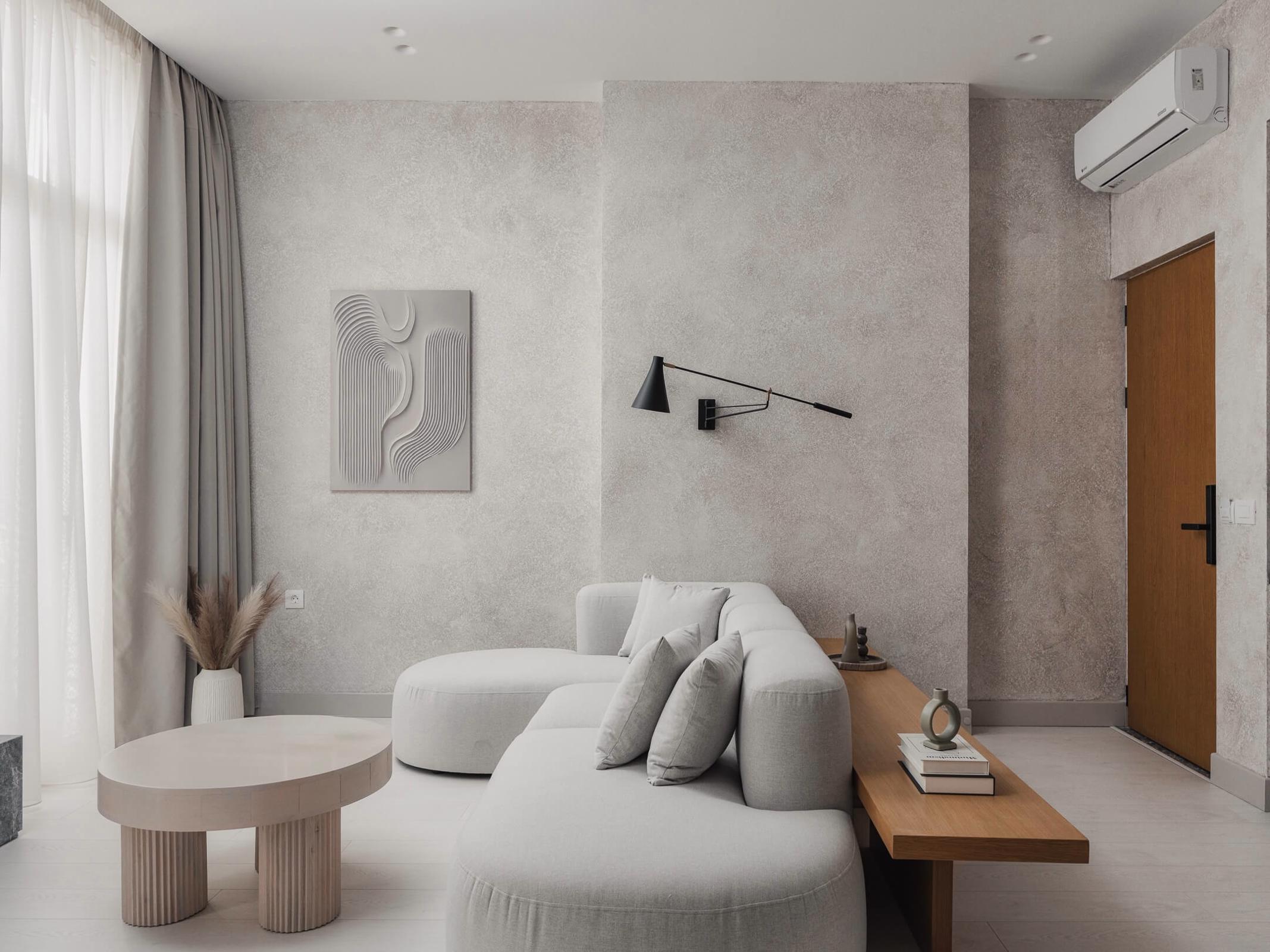 The living area is elegantly furnished with designer pieces and a Smart TV, while the fully equipped kitchen or kitchenette provides all the comforts of a modern apartment. The blend of minimal design, wood, marble, and soft textures enhances the feeling of harmony and understated luxury.