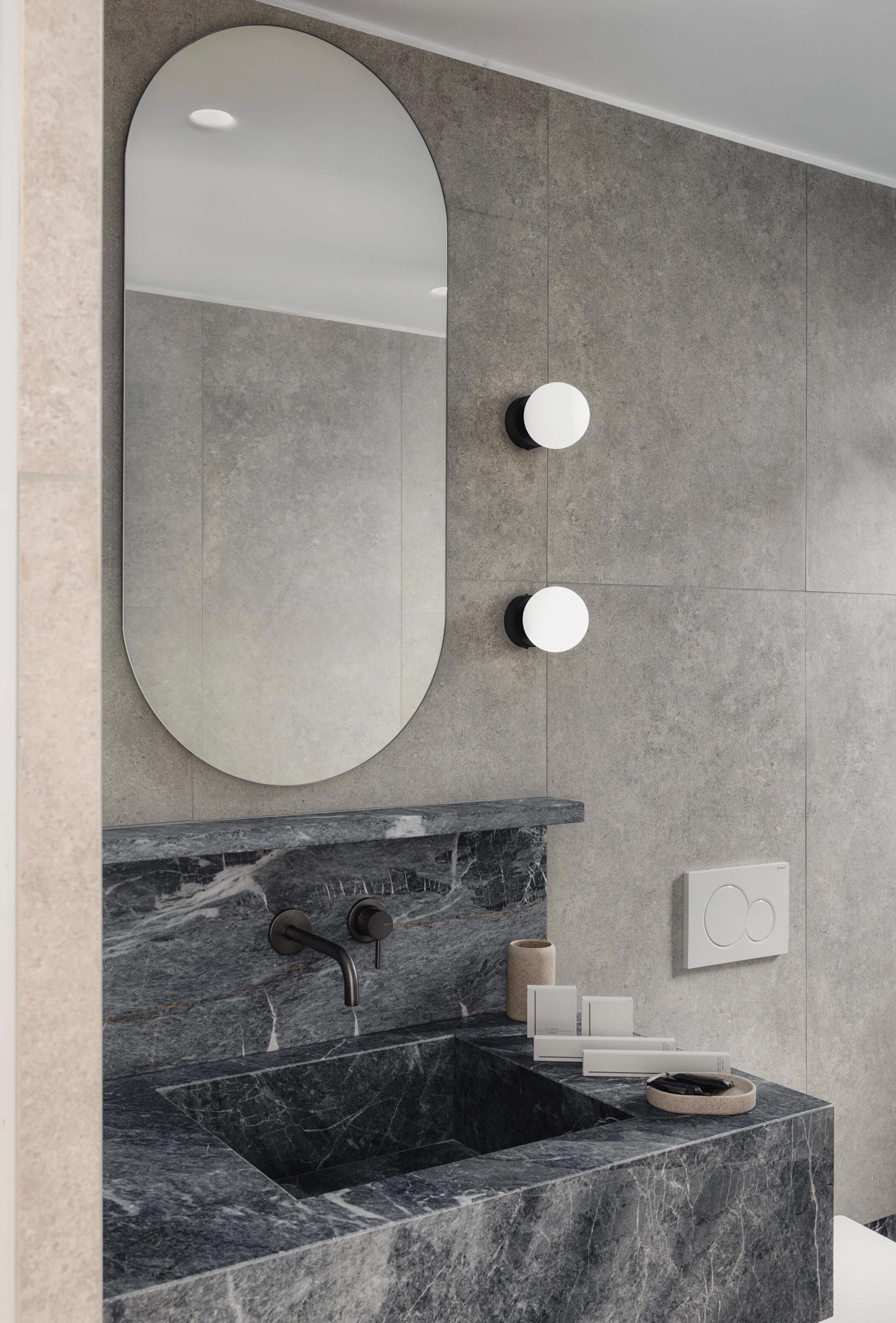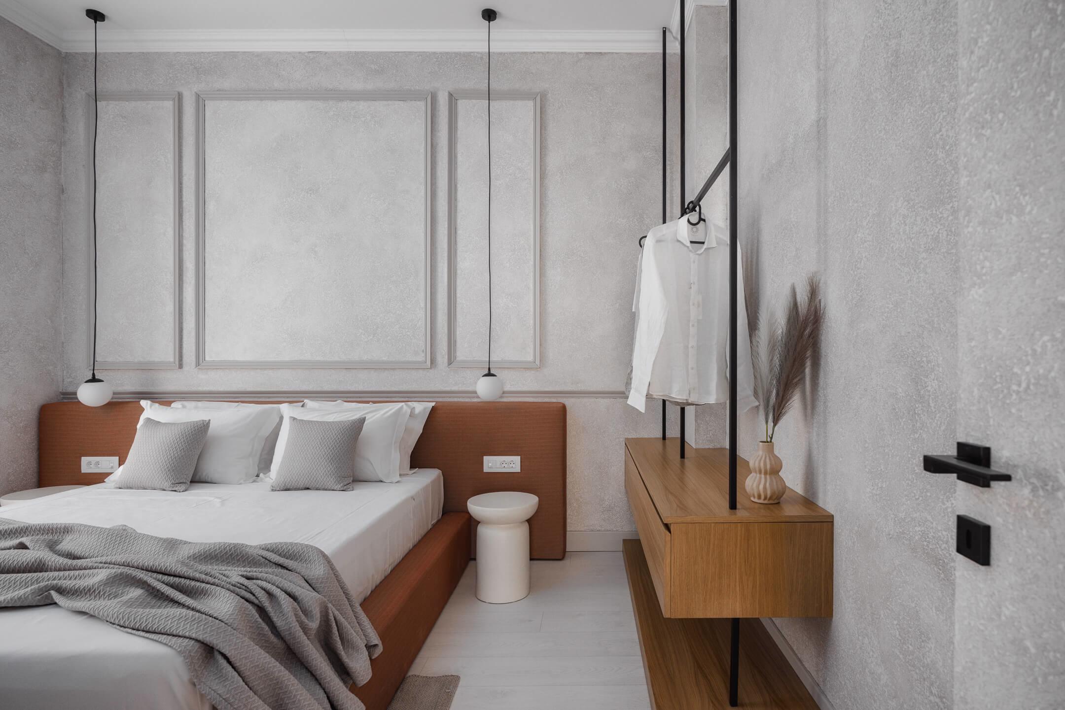 The living area is elegantly furnished with designer pieces and a Smart TV, while the fully equipped kitchen or kitchenette provides all the comforts of a modern apartment. The blend of minimal design, wood, marble, and soft textures enhances the feeling of harmony and understated luxury.