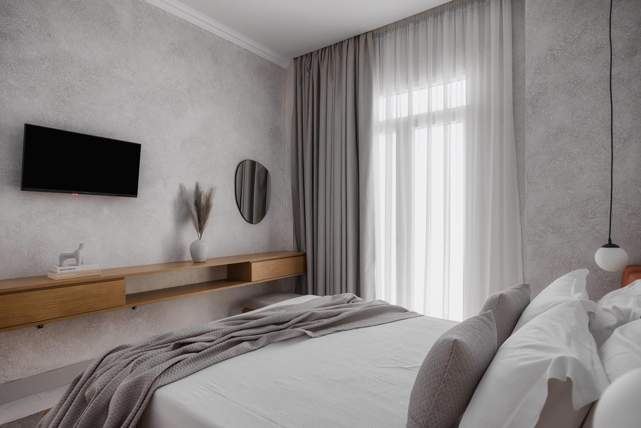 The décor follows the minimalist style of our other suites, featuring earthy tones, natural materials, and carefully selected details that create an atmosphere of calm and sophistication. Each bedroom includes a comfortable double bed and access to a private balcony, ideal for relaxing moments with city or sea views, depending on the suite type.
